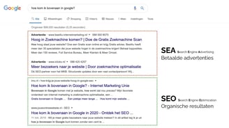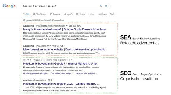 Wanneer je een zoekopdracht invoert, verschijnen als eerste de betaalde zoekresultaten op de pagina. Deze advertenties, die lijken op normale zoekresultaten, worden weergegeven boven de organische zoekresultaten. Hoewel zoekmachines verplicht zijn dit aan te geven, doen ze dit vaak subtiel. Dit type advertenties staat bekend als Search Engine Advertising (SEA).